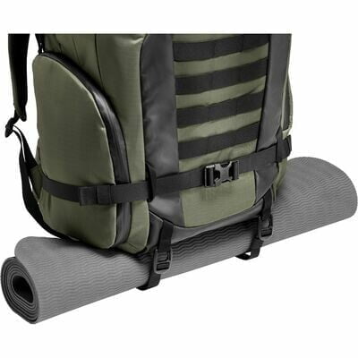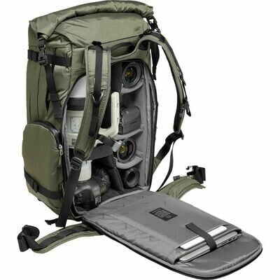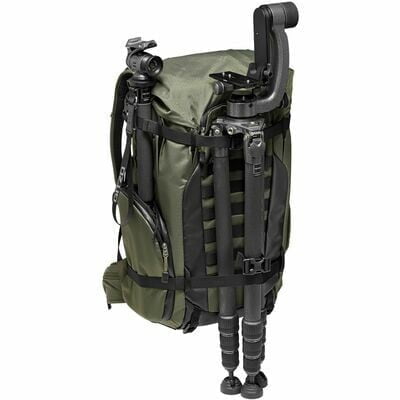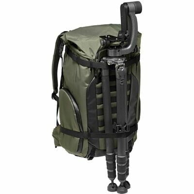 The Adventury backpack gives you rear access to the main compartment via a full-length zipper, so you can easily store or retrieve your gear, and offers an expandable roll top so you can pack personal items without messing up your workflow. On each side, large zippered pockets expand in width for extra space and can hold a water bottle or even a small tripod. Tripods and monopods can also be carried with the multi-link straps in the back, or the dual straps at the bottom of the bag. Additionally, other exterior pockets and accessory loops can be used to transport small items.