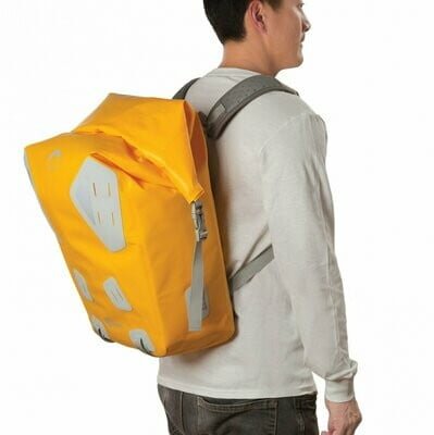 This yellow waterproof DryZone Backpack 40L from Lowepro can hold a DSLR with an attached 70-200 f/2.8 lens, two extra lenses, a flash, and accessories. It is made of a lightweight 210D TPU tarpaulin and features a waterproof rating of IPX-6, which indicates that the backpack is protected against high pressure water streams.